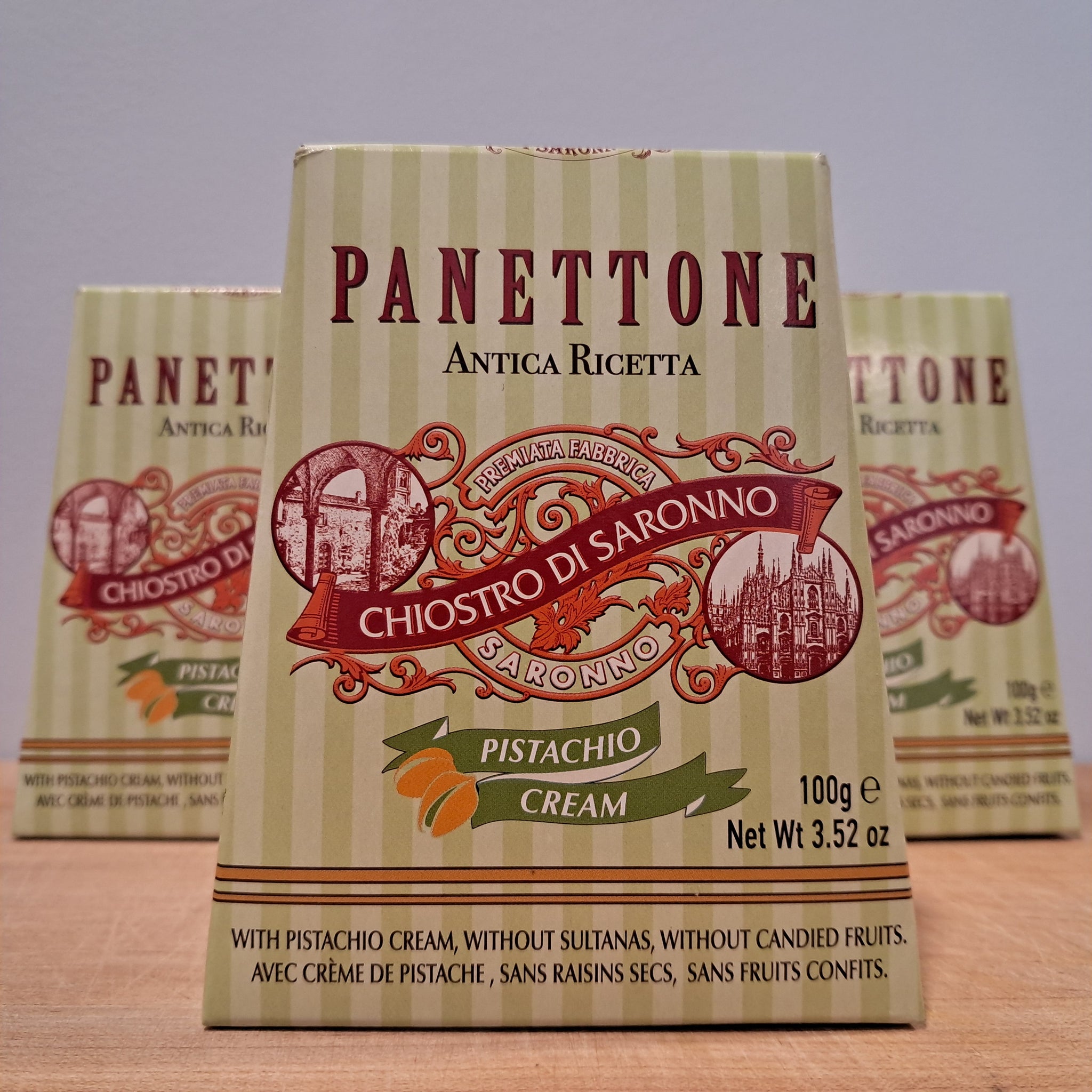 Pistachio Cream: with pistachio cream, and without sultanas and candied fruit.