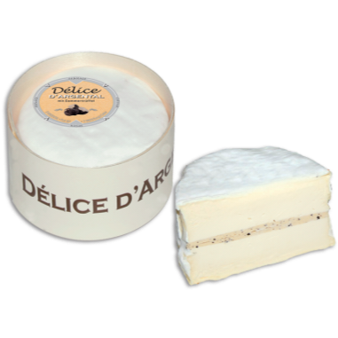 Création Fromi. This soft cheese with mainly acidic curdling is typical for the Burgundy region in which it is produced according to the best artisan tradition of hand-ladled Brillats Savarins. Every single cheese is carefully placed in the mould with a ladle and stuffed with a mixture of Mascarpone and truffles (2% truffle). For its 6 days long ripening the cheese requires low temperatures in order to develop its microbial flora. It then presents a white to cream-coloured fuzz on the rind. A mild, smooth, melt-in-your-mouth cheese which one should enjoy at room temperature for the full taste experience. Its packaging in a wooden box ensures the perfect level of ripeness.